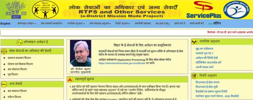 - इस वेबसाइट पर आने के बाद आपको होम पेज खुलेगा Service Plus Bihar होम पेज पर सबसे ऊपर RTPS सेवा एक ऑप्शन दिखाई देगा जिस पर क्लिक करेंगे