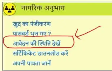 - होम पेज पर आपको राइट साइड कॉर्नर में नागरिक अनुभाग के अंतर्गत आवेदन की गई स्थिति देखें का लिंक मिलेगा जिस पर क्लिक करेंगे